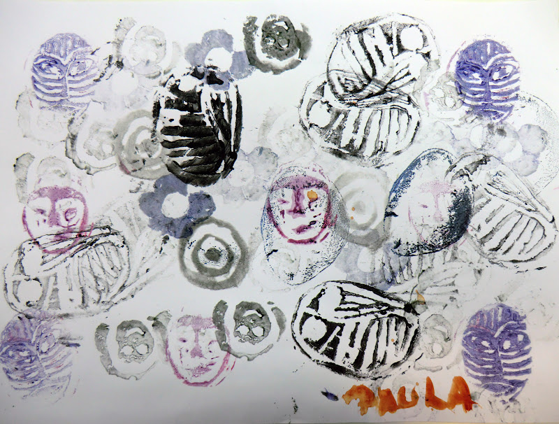 Hemos utilizado para este trabajo como plancha de grabado patatas, limones, zanahorias, manzanas, hojas etc. Los niños han creado sus propias composiciones a partir de las distintas formas y dibujos grabados.